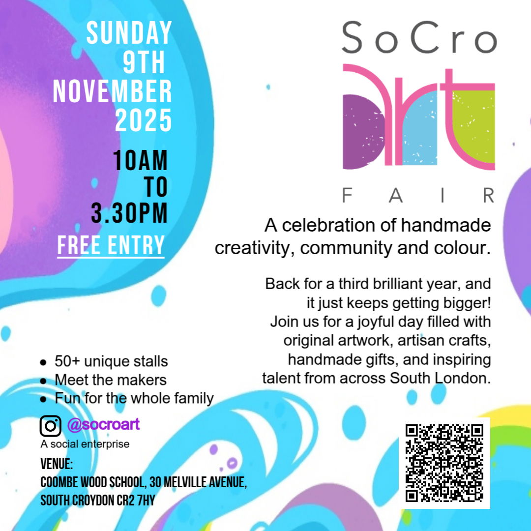 "We had a fabulous day at the SoCro Art Fair - we were made to feel very welcome and what a wonderful group of artists and craftspeople you brought together! The location was excellent- great atmosphere, nice and warm and plenty of light 😊 Amazing turnout for the first event too ! Thank you Sharmina for a lovely event- well done 👍"